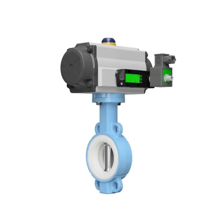 Wafer Pattern V-Tork Actuated Pneumatic Butterfly Valves are a critical component in modern fluid control systems. These valves are designed for efficient regulation and isolation of flow within piping systems, particularly in industrial settings where precise control and reliability are paramount. The wafer pattern design is a compact and space-saving configuration that allows for easy installation between flanges. The V-Tork actuator provides pneumatic control, enabling quick and accurate positioning of the valve disc. This design is known for its lightweight structure, making it ideal for applications where space and weight are constraints.