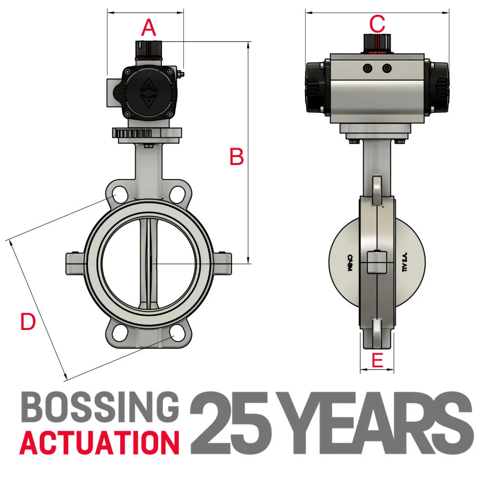 Actuated Butterfly Valves are available in both pneumatic and electric operation and can be beneficial for use in remotely accessed areas, valves that require larger torque figures to operate, timing or synchronisation and reliability. Pneumatically Actuated Butterfly Valves provide the quickest form of operational control for open/close functionality and are available in both double acting and spring return units with either direct/solenoid operation. Spring Return units can be set up in a fail-safe closed mode for critical lines were the Valve will return to the closed position upon the event of power failure through the loaded springs. Fail-safe open Valves are also available upon request.